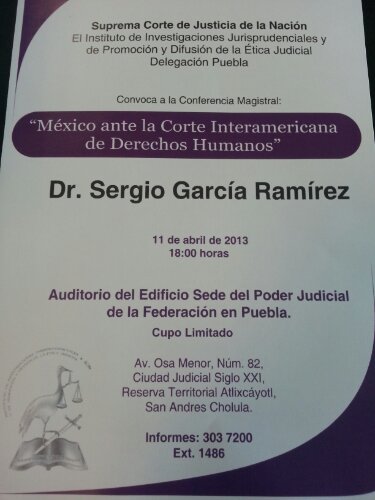 Jueves 11 de abril de 2013. Edificio sede del PJF en Puebla. 6 pm. Entrada libre. Cupo limitado.