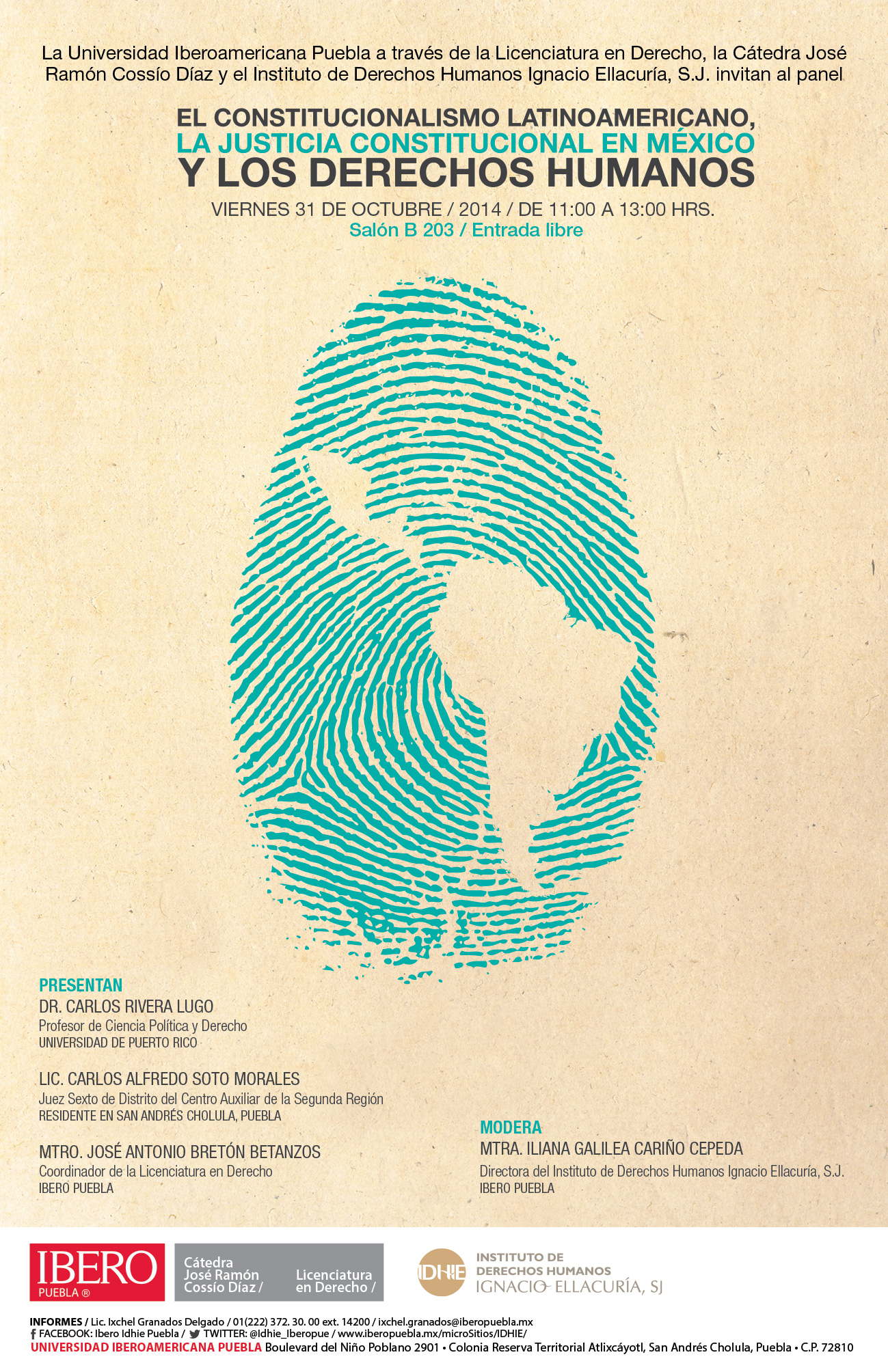 El próximo viernes 31 de octubre de 2014, en la Universidad Iberoamericana – Puebla – tendrá lugar la conferencia «Constitucionalismo latinoamericano, justicia constitucional en México y derechos humanos». Los esperamos.