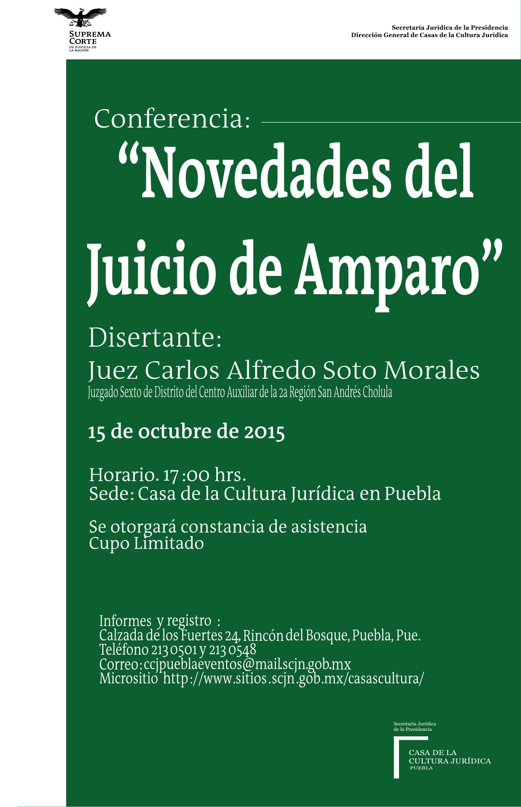 El jueves 15 de octubre de 2015 estaré en la Casa de la Cultura Jurídica de Puebla para platicar sobre las novedades del juicio de amparo. Los espero.